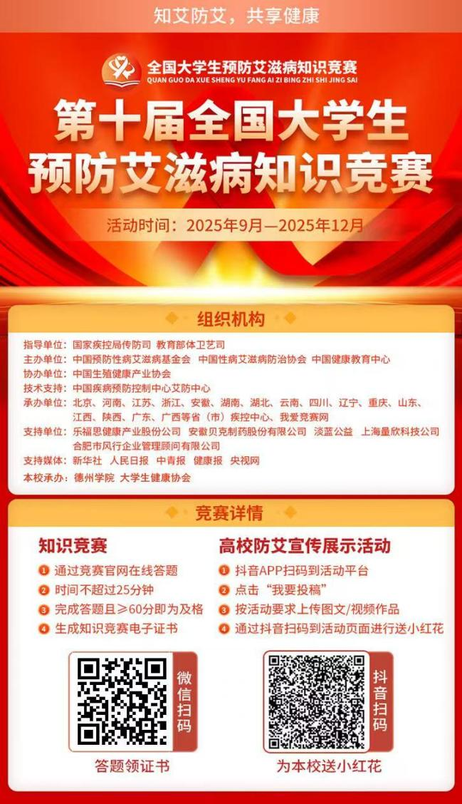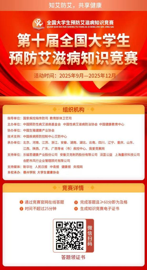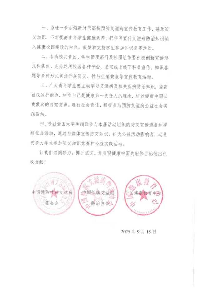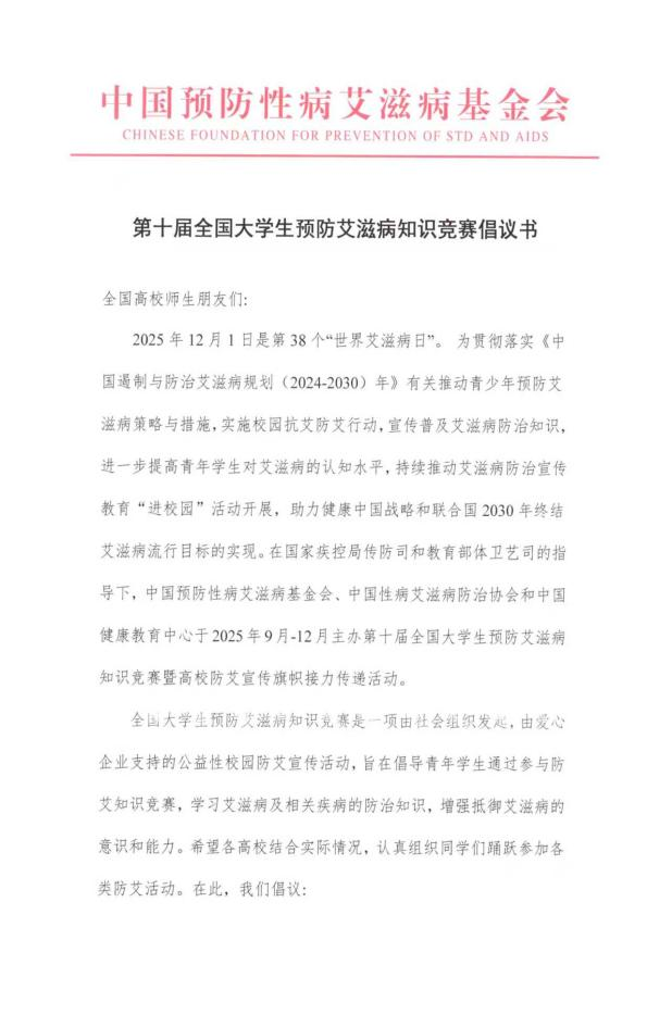 在第38个“世界艾滋病日”来临之际,为深入贯彻落实《中国遏制与防治艾滋病规划2024-2030年》策略与措施,宣传普及艾滋病防治知识,进一步提高青年学生对艾滋病的认知水平,持续推动艾滋病防治宣传教育“进校园”活动开展,助力健康中国战略和联合国 2030 年终结艾滋病流行目标的实现。在国家疾控局传防司和教育部体卫艺司的指导下,中国预防性病艾滋病基金会、中国性病艾滋病防治协会和中国健康教育中心主办“第十届全国大学生预防艾滋病知识竞赛暨高校防艾宣传旗帜接力传递活动”。本次竞赛旨在普及宣传防治艾滋病相关知识,提高大学生抵御艾滋病的能力,为解决我国艾滋病防治做出应有的贡献。
